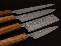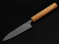 Messer von Yoshimi Kato vereint Schönheit und Funktionalität in einem Meisterstück. Der Griff aus italienischem Olivenholz, gewachst, achteckig geformt, liegt perfekt in der Hand. Sofort wird der Wunsch wach, die Damastklinge ihrem eigentlichen Zweck zuzuführen. Die ca. 170 mm lange Klinge, eine sehr gute Länge für das Allzweckmesser, wurde aus SG2 Stahl und vielen Schichten Damaststahl gefertigt. Der renommierte Stahlhersteller Takefu Special Steel bezeichnet den Stahl als Super Gold 2 (SPG2). Es ist ein pulvermetallurgischer, rostfreier Stahl mit einigen Besonderheiten. Messer-Schmiede und Messer-Liebhaber schätzen besonders die homogene, feine Struktur, den hohen Härtegrad von 63