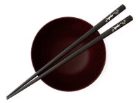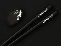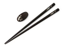 von Yumekobo. Das Set besteht aus einem Paar Essstäbchen und einer passenden Essstäbchen-Ablage. Die Essstäbchen wie auch die Ablage wurden von Zogan-Künstlern mit feinen Perlmutt-Einlagen verziert. Yumekobo gilt als eine der wenigen Manufakturen in Japan, die die traditionelle Dekorationstechnik Zogan für feine, edle Gebrauchsgegenstände wie Essstäbchen einsetzen und perfekt beherrschen. Die verwendeten Hölzer sind von ausgesuchter Qualität und werden ausschließlich in traditioneller Handwerkskunst bearbeitet. Alle eingesetzten Materialien sind pure Natur. Die sehr langlebigen, edlen Essstäbchen sind 22,5 cm lang und werden zusammen mit der Ablage in einer schönen Geschenkbox geliefert. Bitte beachten Sie unsere Pflegehinweise.