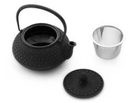 wird der Tee aufgegossen. Meist ist sie innen emailliert, was die Abgabe von Eisen und Mineralien, die im hochwertigen, japanischen Gusseisen vorhanden sind, bremst. Aber auch Emaille ist nicht vollkommen dicht, so dass Tee aus einer hochwertigen Iwachu-Teekanne einen reicheren Geschmack erhalten wird. Minderwertige Kannen sollte der Teekenner aus geschmacklichen und gesundheitlichen Gründen meiden. Achten Sie deshalb darauf, dass die Teekanne mit dem Original-Stempel von Iwachu oder anderen hochwertigen Herstellern ausgestattet ist.