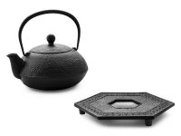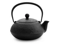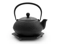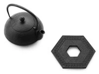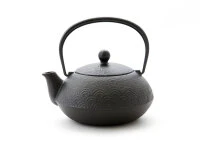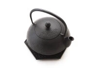 Die schöne Welle – Nami Aomi – ist ziemlich einzigartig. Nami Aomi ist sowohl ein Wasserkessel wie auch eine Teekanne, eines von ganz wenigen wirklich tauglichen, hochwertigen Kombimodellen (Teekanne und Tetsubin), die es gibt. Nami Aomi ist aus natürlichem japanischem Gusseisen, von meisterlicher Hand hergestellt, fasst 0,65 Liter, ist mit einem Edelstahl-Teesieb ausgestattet und unser Angebot enthält auch den passenden Untersetzer aus Gusseisen. Die Teekanne ist nicht emailliert hat aber einen natürlichen Rostschutz durch aktiviertes Eisen (Kamayaki-Verarbeitung). Nami Aomi ist die sehr praktische und auch preiswerte Lösung für Teeliebhaber, die authentisch Grünen Tee oder andere Tees genießen möchten. Da die Oberfläche im Innern nicht emailliert ist, empfehlen wir die Nami Aomi für nicht oder nicht zu stark aromatisierte Teesorten, da die Teekanne mit der Zeit den Geschmack des Tees aufnimmt und andere, mildere Tees beeinträchtigen könnte. Nami Aomi ist für Elektroherde und für Gasherde geeignet, wer einen Induktionsherd besitzt, sollte sich für ein anderes Modell entscheiden. Bei längerem Kochen wird das Wasser mit etwas natürlichem Eisen angereichert, das vom menschlichen Körper sehr gut aufgenommen werden kann.